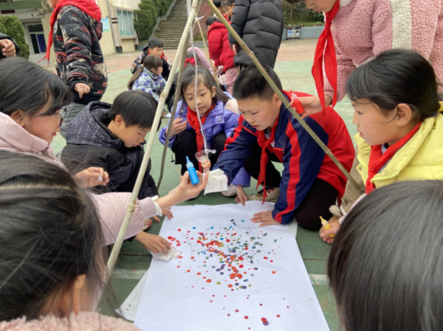 在“自然艺术创作”环节,孩子们用颜料和画笔将探索所得化为天马行空的画作:五彩斑斓的山山水水、郁郁葱葱的森林、星空下的田野……一幅幅充满童趣的作品展现了他们对自然的热爱与想象。活动尾声,孩子们手持画作合影留念,为春日校园增添一抹亮色。