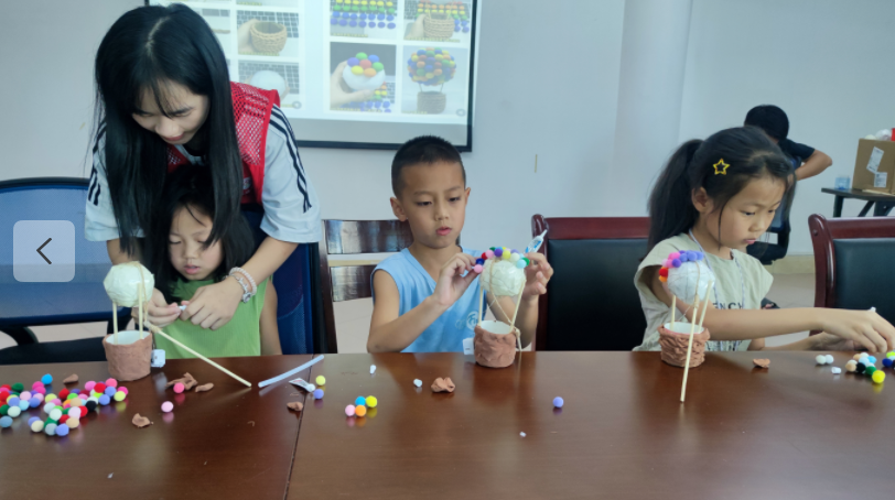 各色毛球如打翻的调色盘,汇成一片柔软而缤纷的海洋,瞬间点燃了小朋友们的创作热情,在志愿者老师的趣味指导下开始了认真的艺术创作。孩子们精心挑选着不同大小与色调的毛球,在圆形球体上构思、排列、组合,仿佛一位位艺术家在为自己的画布布局谋篇。那一双双巧手将一颗颗蓬松软糯的毛球小心翼翼地粘贴固定。最终,通过孩子们的努力,一件件毛绒可爱、充满童趣的热气球惊艳亮相。孩子们高兴的欣赏着自己的艺术品。从挑选到粘贴,全程锻炼动手能力、色彩感知力和专注力,每个孩子都是最耀眼的小小创造家!